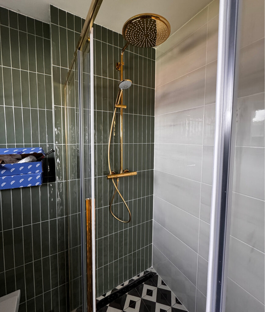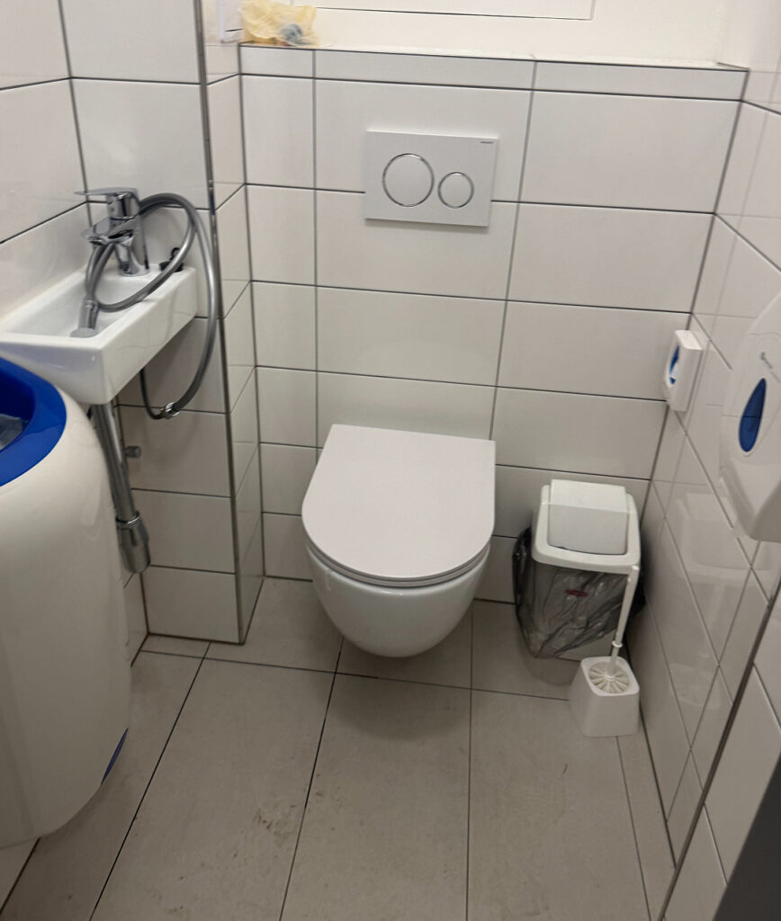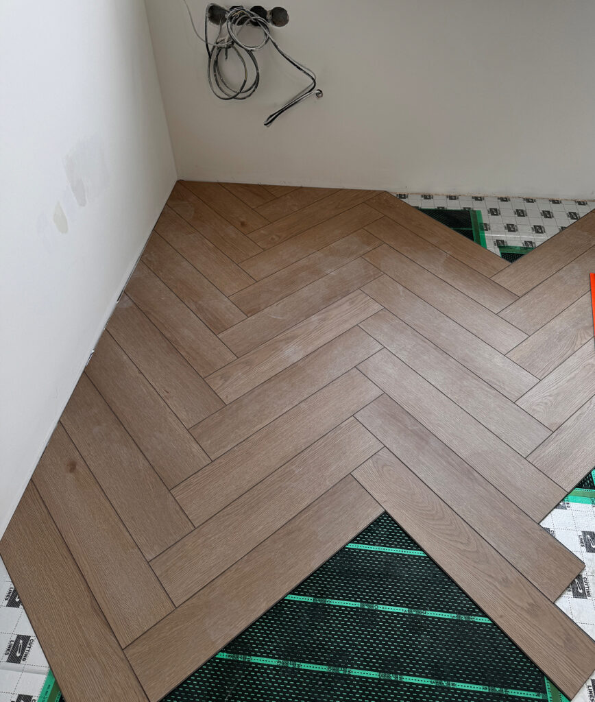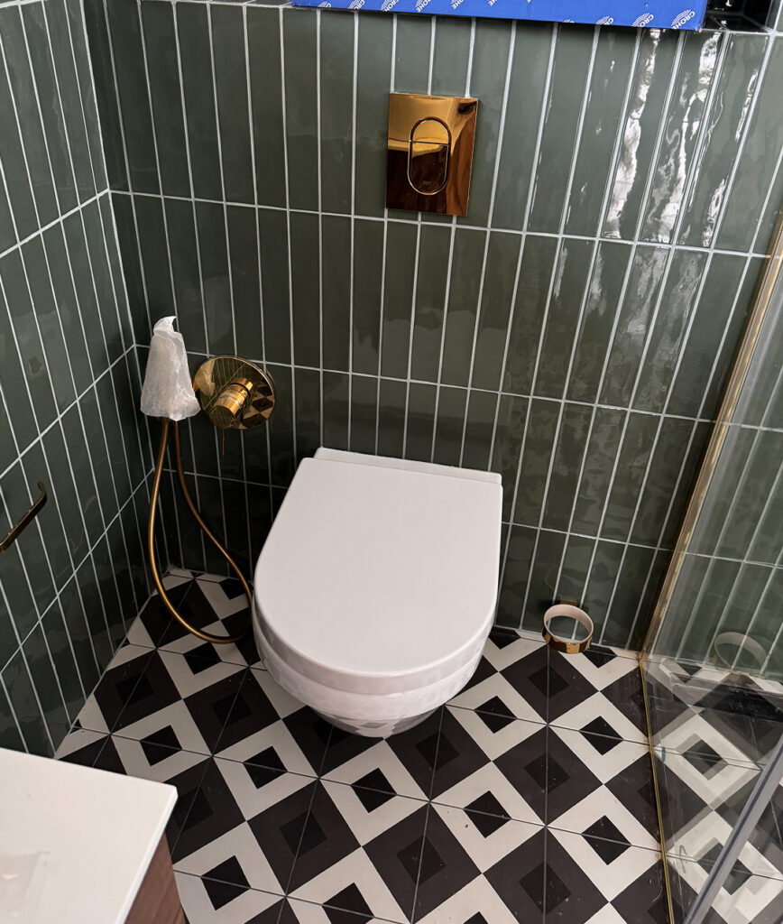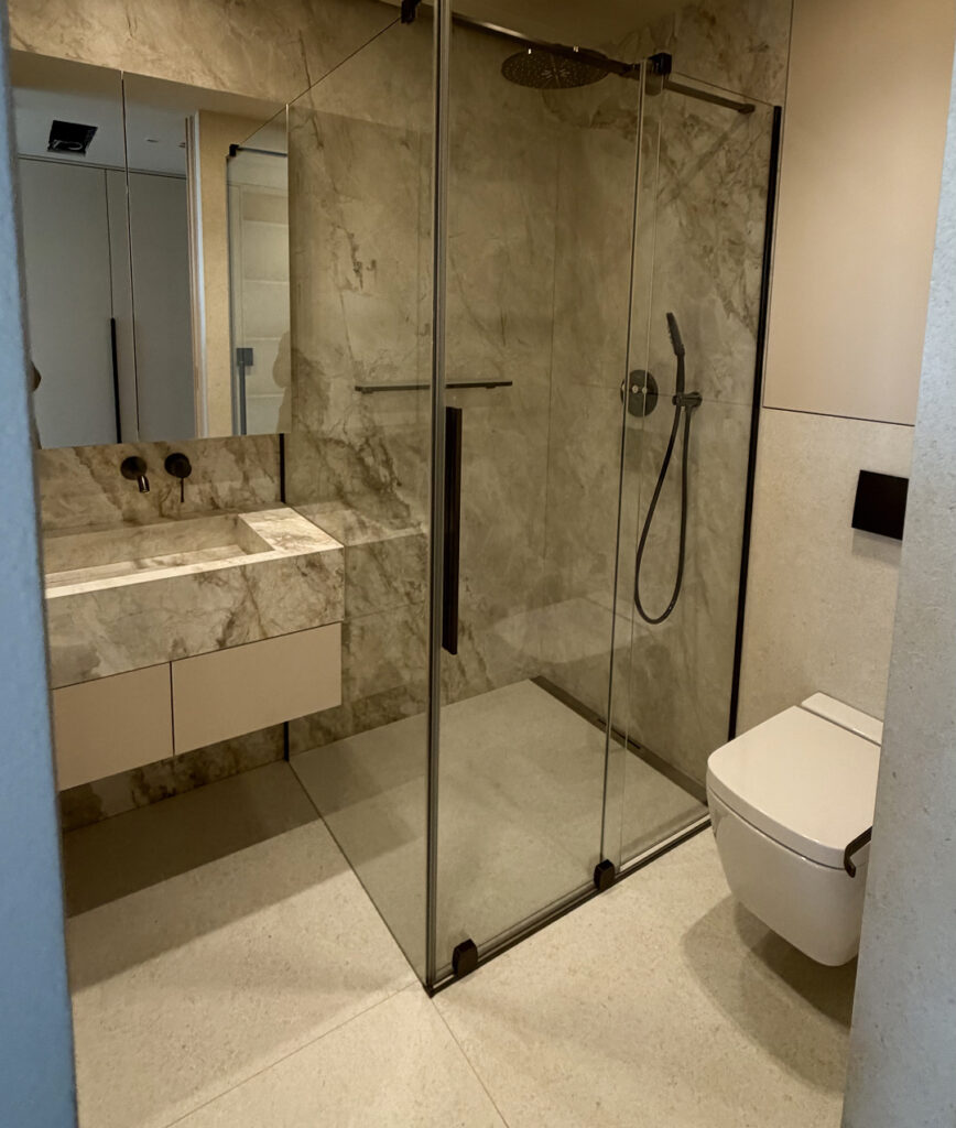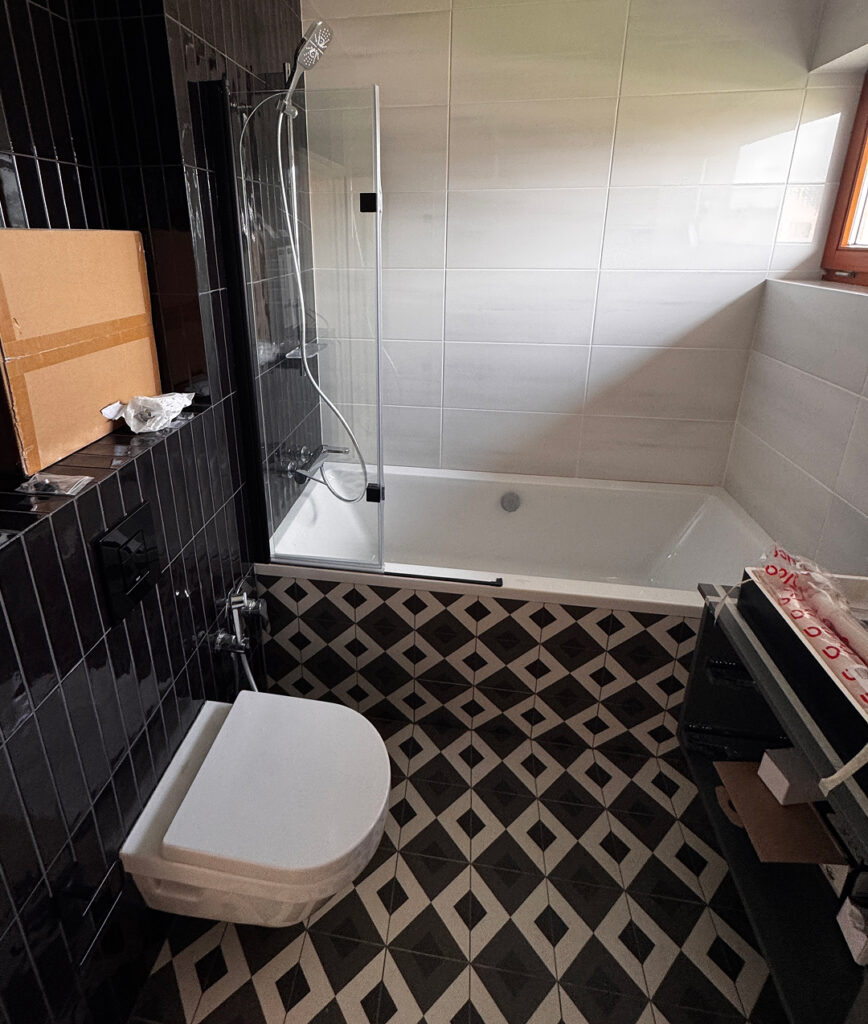 Kompletní rekonstrukce koupelny a WC, včetně nového podlahového topení, odborné demontáže a montáže, vyrovnání podlah a instalace závěsného WC místo původního.