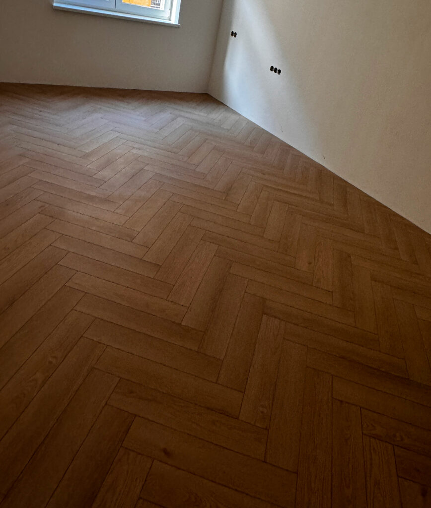 Rekonstrukce podlahy a koupelny, včetně pokládky OSB desek pro rovný povrch a nové podlahy. V rámci práce byla také zrekonstruována koupelna.